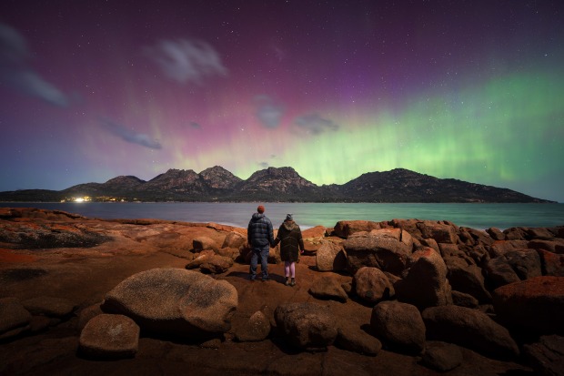 A couple embrace and a stunning display of aurora australis at Freycinet National Park.