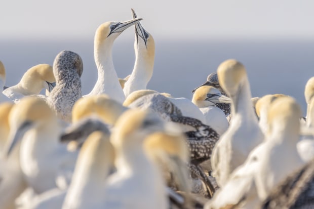 Two adult Australian gannets touch bills in a quick courtship moment.