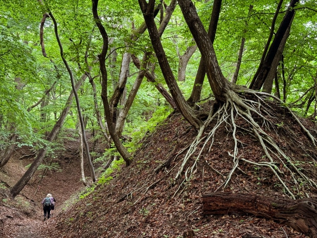 Whilst hiking in Japan, I was struck by the incredible size of the tree root mounds leaning in towards my friend as she hiked through, a tunnel of trees.