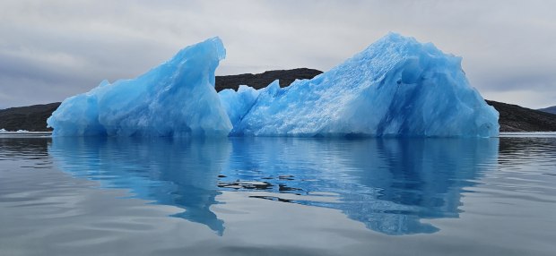I took this photo in a fjord near Narsarsuaq, South Greenland whilst on a kayaking tour. After two days of being shore bound due to strong winds, on the third our group experienced glassy water conditions. While there were many spectacular icebergs in the fjord, with its strong blue colour this iceberg stood out from the rest. However, its true grandeur was not evident until I paddled around to the rear of the iceberg.