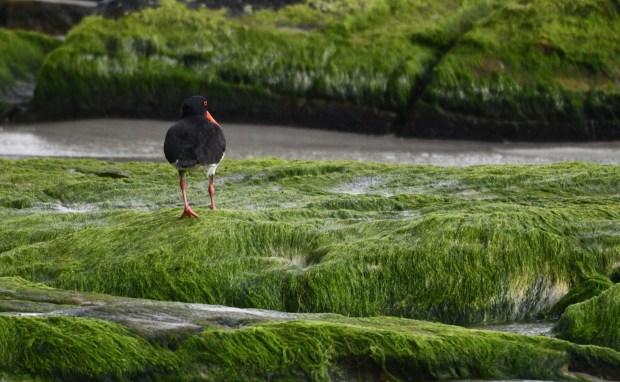 The tide was going out revealing this lush green and then the bird came to explore it before it began raining again