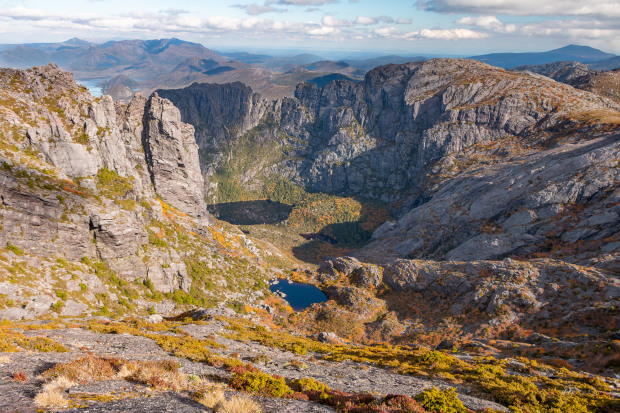 Mount Murchison, Tasmania during fagus season, when Tasmania’s only deciduous beech (Nothofagus gunnii) paints the alpine landscape in warm hues. Mountain peaks and mirrored tarns are bathed in autumn light - untouched beauty.