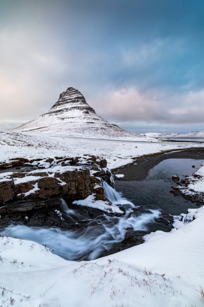 Standing at an impressive height of 463 metres and surrounded by stunning glacially-fed waterfalls, which flow into the sea. It's no wonder this spot had been on my bucket list for so long. With anticipation can often come the stress of expectation. However, with a fresh blanket of snow falling on this beautiful scene and getting to share the space with my partner, I was grateful just to feel present here. Admiring its beauty and getting into a Flow State creatively. I feel that the image and the flowing falls capture this sentiment perfectly!