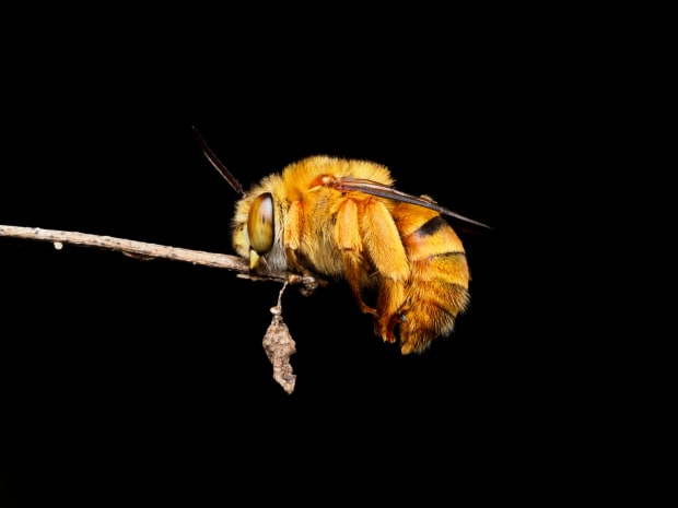Single shot of a snoozing bee. The single dried leaf gives the impression of a ripe fruit like an apple with a single leaf on the stem. Which gives a nice nod to the importance of bees for fruiting plants.