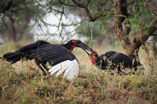 In the Serengeti, two male ground hornbills - a vulnerable and not often seen species - interlock beaks in a dispute about which we can only guess.