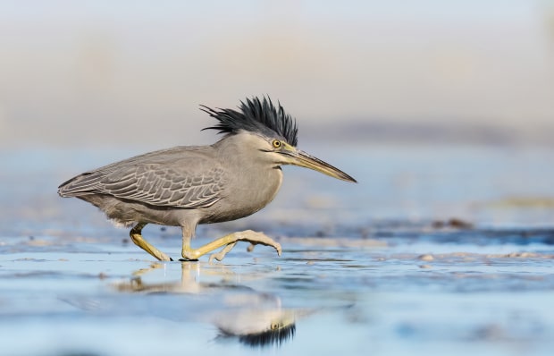 A striated heron hunts in the roebuck conservation park for mudskippers creating an opportunity for a low level photo at the bird height - this was taken lying in the mud where the egrets were hunting