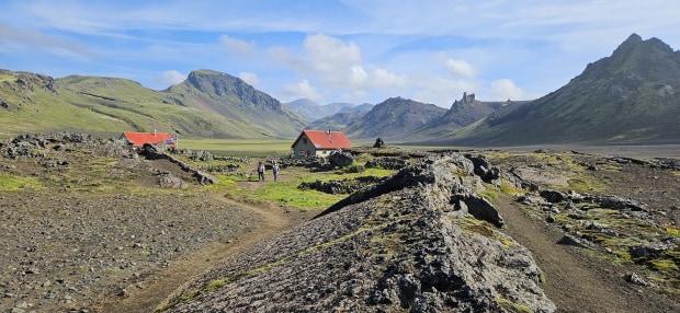 The Laugavegur Trail in Iceland showcases many of Iceland's geological wonders. This photo captures two hiking buddies whom I met on the trail, Cecile and Jen, within the awesome backdrop of the Hvanngil Valley. I love the way the colour and formality of Hvanngil Hut contrasts the rugged mountain ranges, while the laval formation in the foreground adds great perspective.