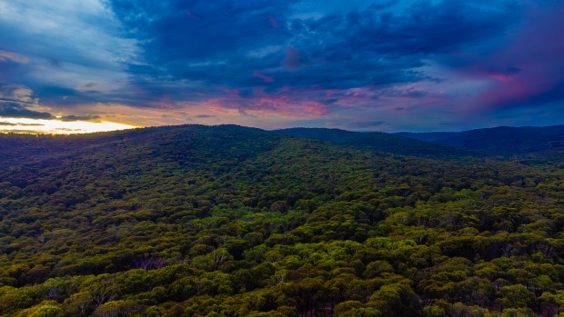 As the sun dipped below the horizon near Moggs Creek, the forest canopy caught the final hues of day—deep greens bathed in soft purples, blues, and amber light. A quiet moment where nature held its breath, suspended between light and shadow.