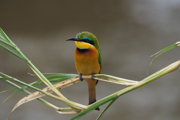 Next to a water crossing in the Serengeti, a little bee-eater clung to a reed as it waved in the breeze, unfazed by the passing vehicle