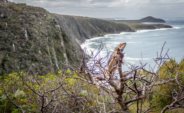 On a trek on the Waitpinga Cliffs trail ( south coast of South Australia we came across this Bearded Dragon lizard basking in the sun perched on a low bush. What made the moment so special was the backdrop of the dramatic coastline in the background as if the reptile was posing for that to be included in the shot! It turned out to be a beautiful encounter with nature in an epic location.