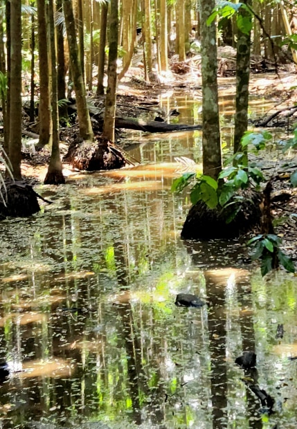 This photograph taken around midday is an image detailing reflections of the rainforest surrounding a still water hole in the creek that is not flowing due to dry weather. Location is Blackall Range area of the Sunshine Coast Hinterland.