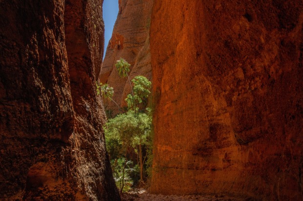Palm forest at the entry to Echidna Chasm, seen from inside the chasm, in Purnululu National Park (the Bungle Bungles), Western Australia