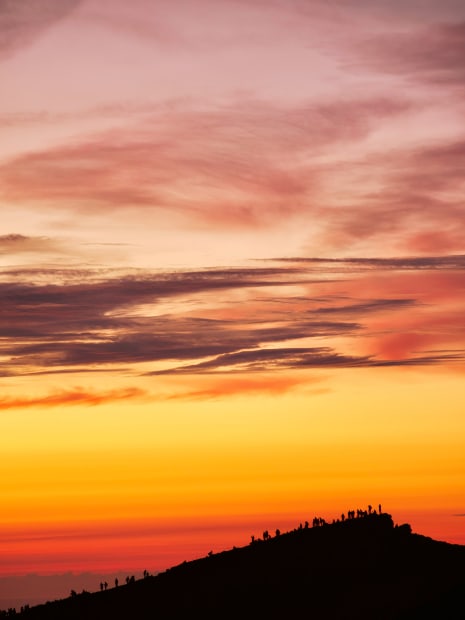 Everyone standing in awe, watching the sunrise from the summit of Mt Fuji.