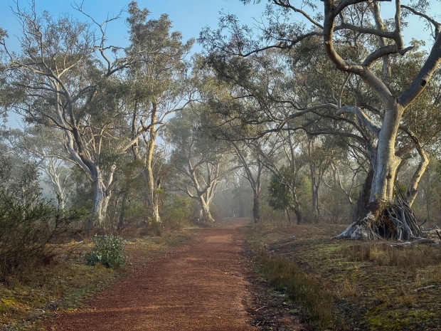 Ancient gums, red clay soil, and misty winter mornings - Ngunnawal lands at their finest.