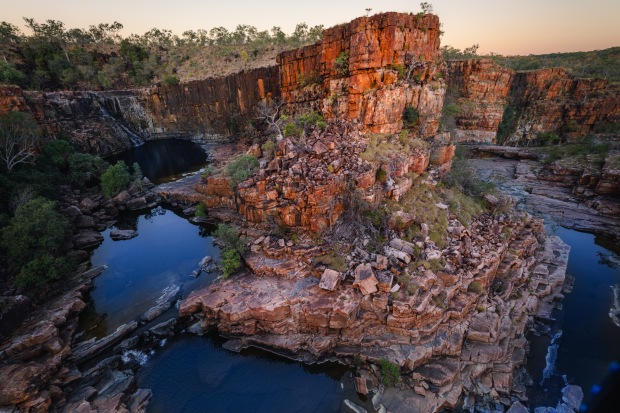 The incredible Twin Flame Falls in the west Kimberley, WA. Only accessible from Mount Hart lodge on the Gibb River Road.