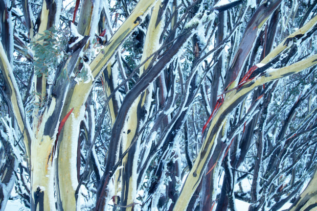 Among the snow-draped slopes, the twisted snowgums reveal themselves as living veins of the mountain. Their sinewed trunks and blood-red bark pulse with life against the frost, carrying resilience and rhythm through the cold silence of winter.