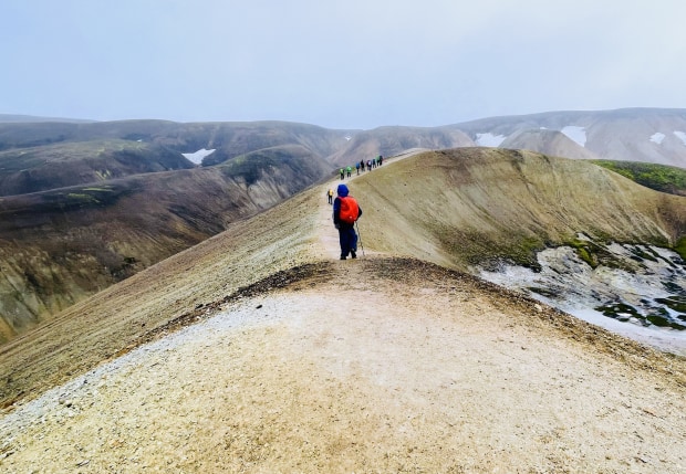 Iceland - Laugavegur trek day 1. Walking the ridge between a drop off on each side. What you can’t see is the pelting rain and blustery winds that made walking the line so much harder than it looks