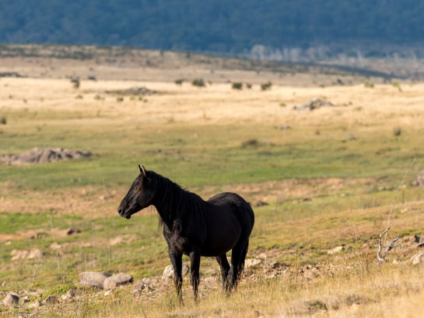 The Wild Stallion staring out onto the vast plains before galloping away with his small herd Snowy Mountains NSW